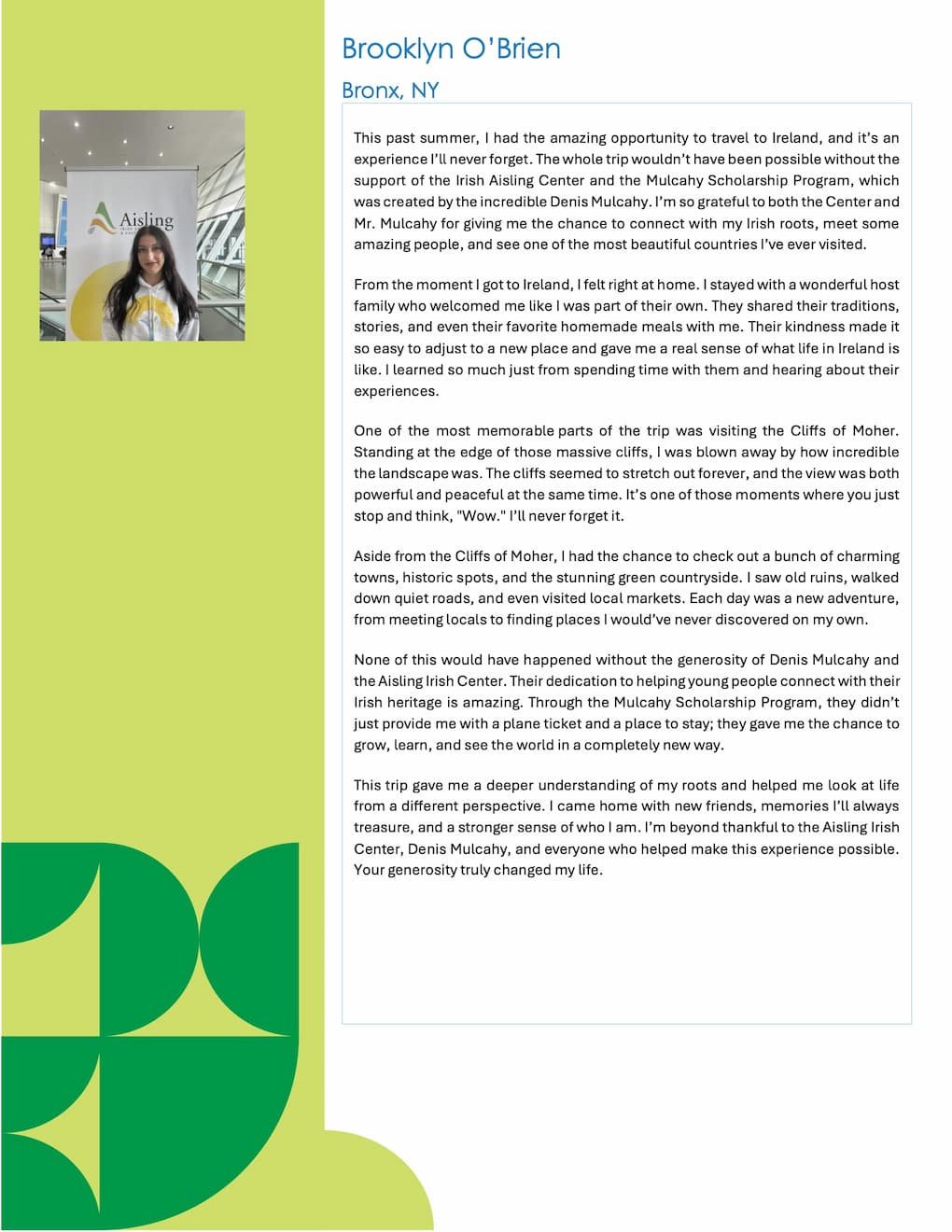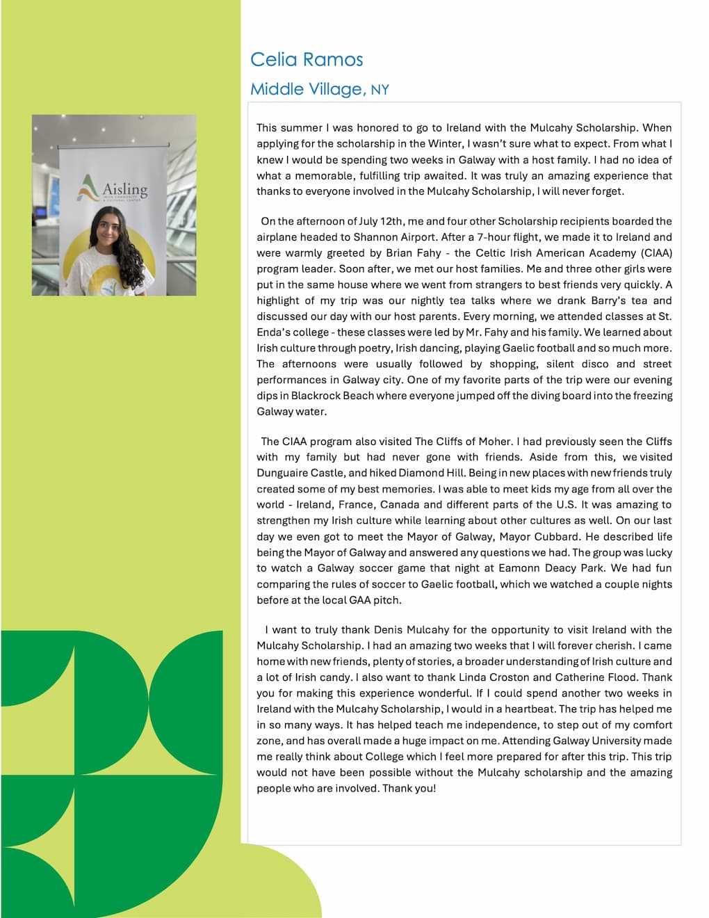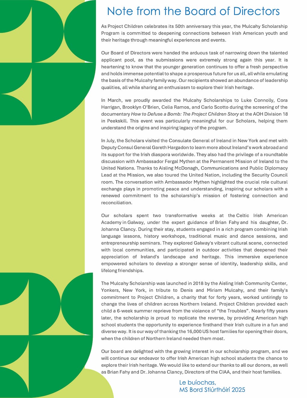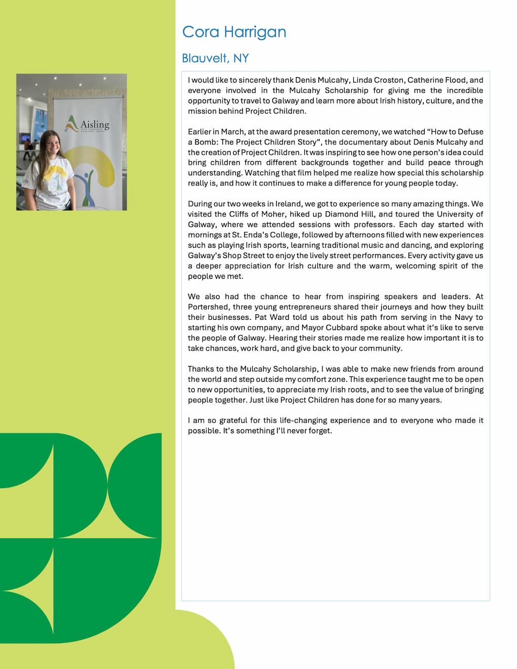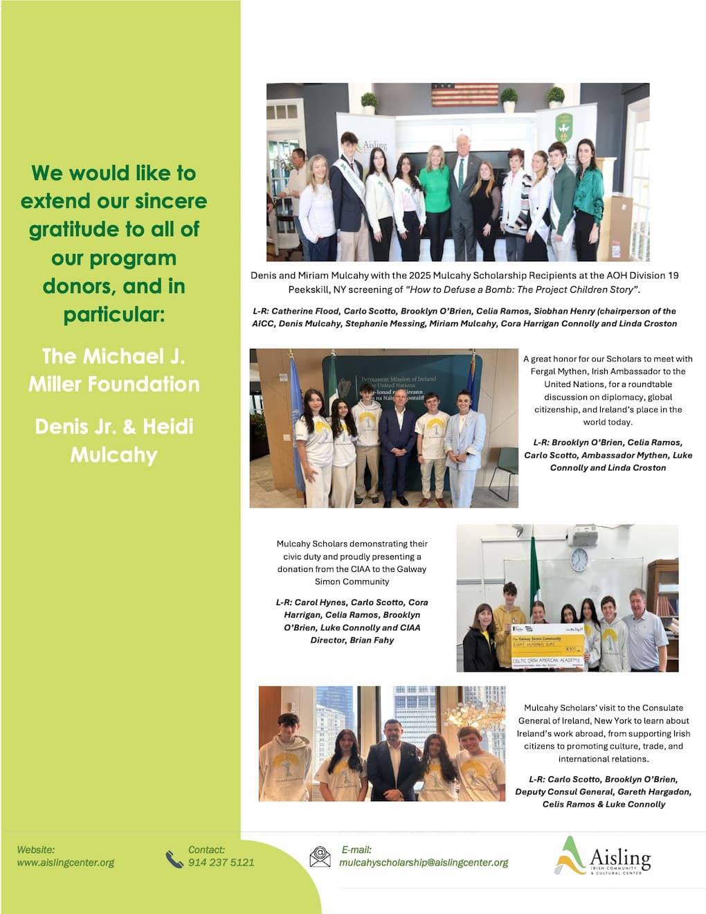 The Mulcahy Scholarship was launched in 2018 by the Aisling Irish Community Center in Yonkers, New York, in tribute to Denis Mulcahy and his family's commitment to Project Children, a charity that for forty years, worked untiringly to change the lives of children across Northern Ireland.