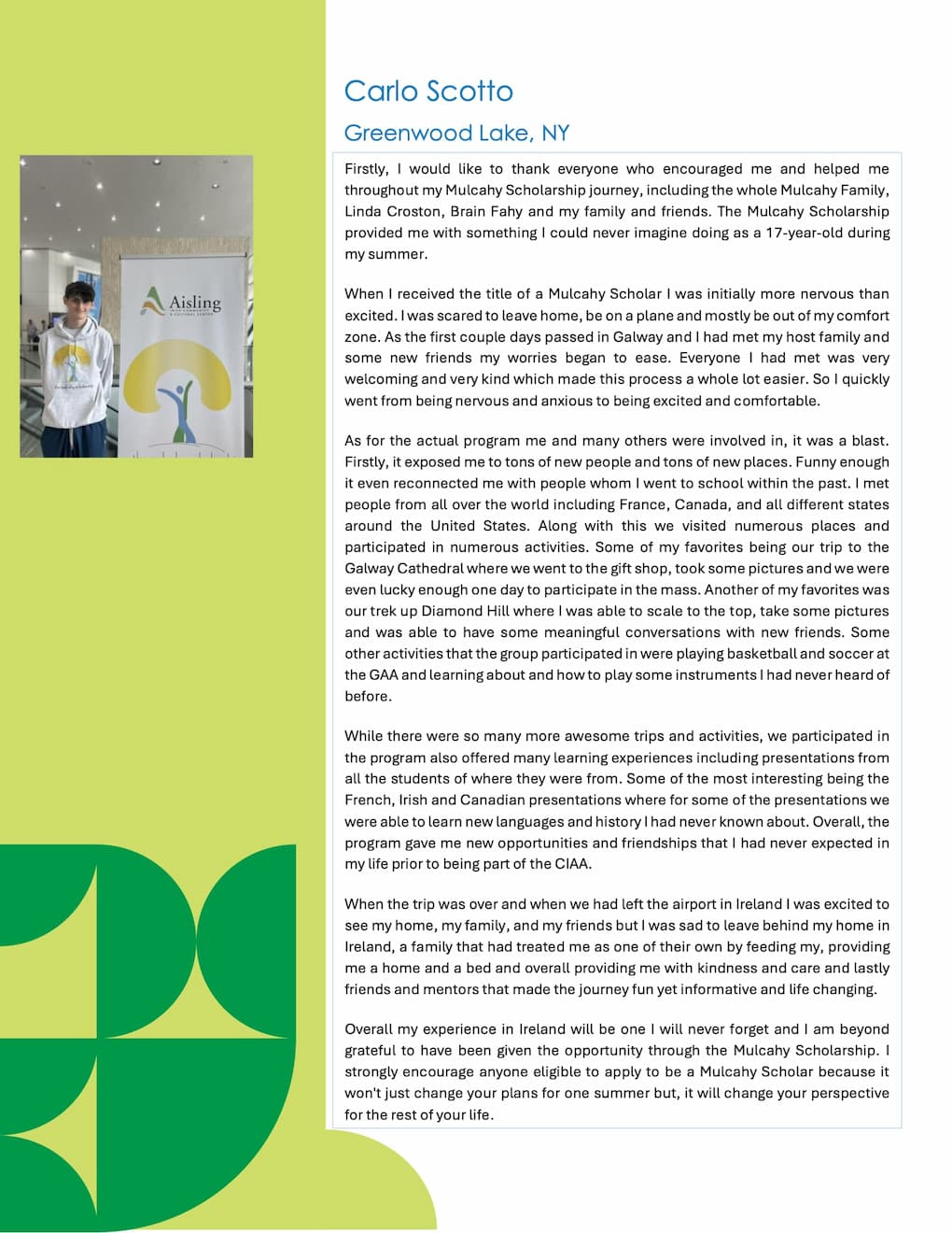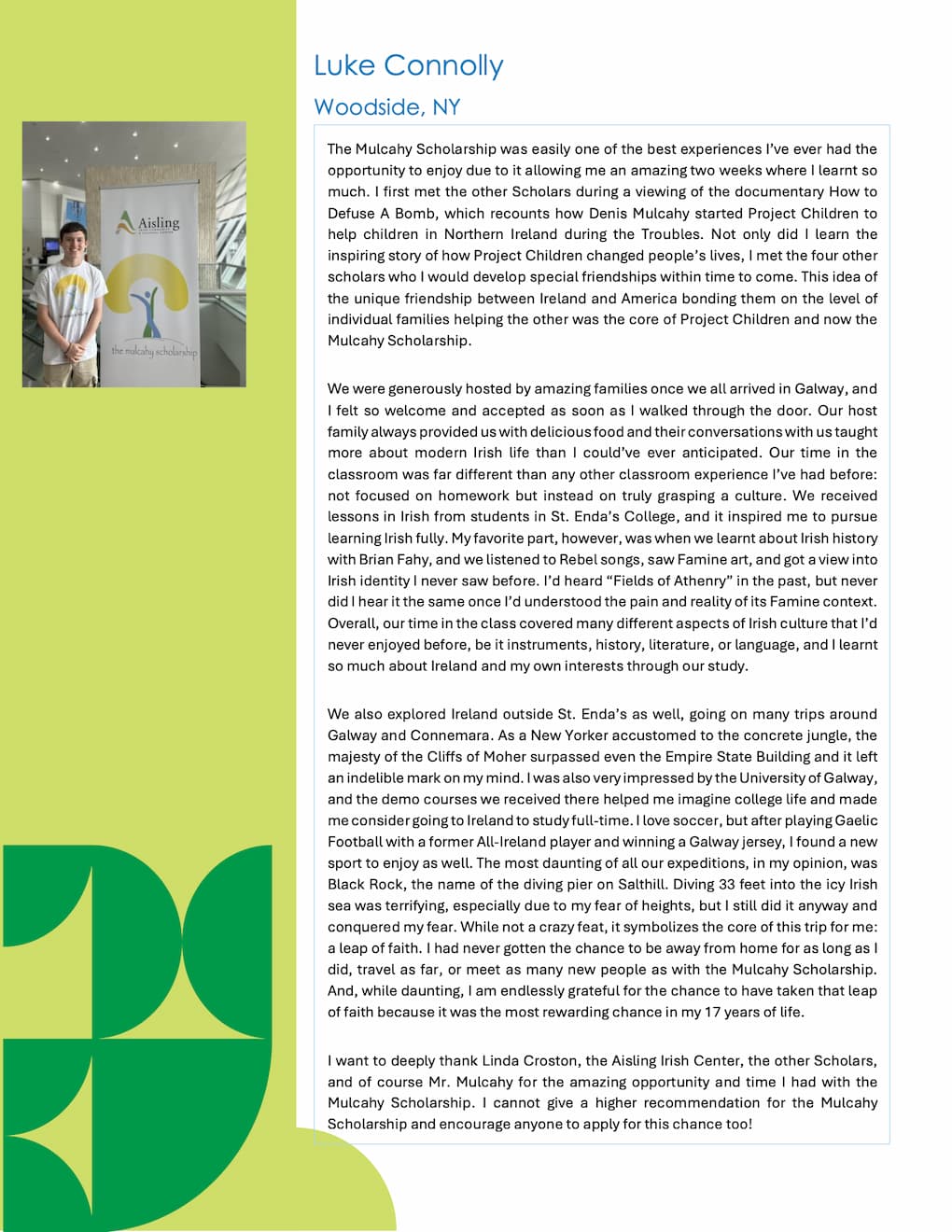 In 2018, the very first Mulcahy Scholarship Award was proudly presented to Conor James. The Aisling Irish Center partnered with Brian Fahy of the Celtic Irish American Academy (CIAA) summer program and Conor attended their summer school based in Galway City. There, Conor participated in the CIAA summer program, forged many friendships, and even learned some “cúpla focal”, all while encompassing the core objective of the scholarship.